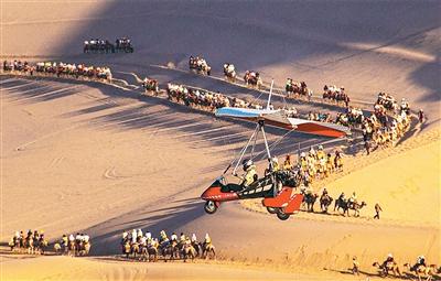 近年来,在甘肃省敦煌市鸣沙山月牙泉景区运营的敦煌“飞天”通用航空项目,为游客提供低空飞行器旅游服务,让游客乘坐直升机、动力滑翔机,从空中欣赏大漠绿洲和月牙泉美景,沉浸式体验敦煌独特魅力。图为7月3日,游客乘坐滑翔机空中俯瞰敦煌大漠风光。