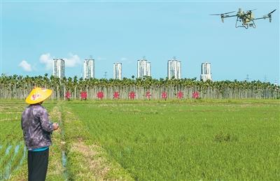 7月6日,海南省琼海市嘉积镇农民在利用无人机喷洒农药。