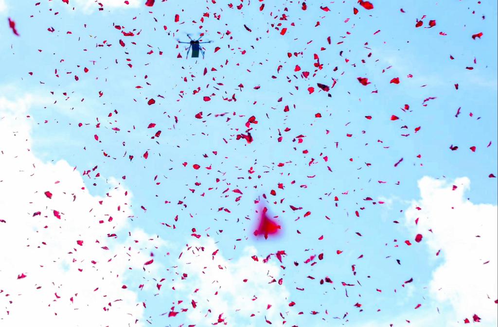 上午10时,上海月湖雕塑公园碧波荡漾、晴空万里,随着一面五星红旗在无人机牵引下徐徐升空,上海玄风航空科技带来的大疆多旋翼挂国旗、穿越机拉烟绕飞拉开了百大飞行应用展演的帷幕。正当人们都在猜测无人机“葫芦里卖的是什么药”时,撒花表演揭开谜底,彩带和玫瑰花瓣顺着风势纷纷扬扬地飘落下来,引发现场观众一阵欢呼声。