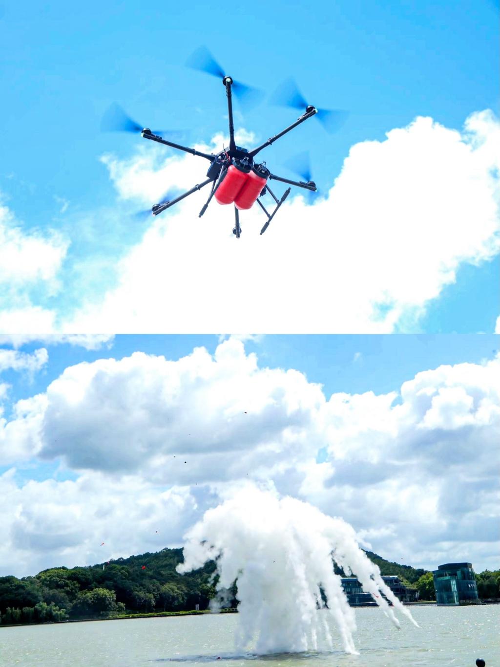 苏州天眸航空科技有限公司带来的消防无人机,“抱着两支红色灭火弹”就垂直升空。在人们的注视下,两枚灭火弹以自由落体依次下落,准确命中水面目标,激起的巨大水浪和爆炸声让观众们看得目不转睛。